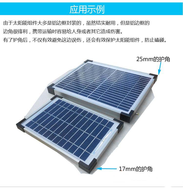 太陽能光伏組件護角(太陽能電池板鋁邊框護角),采用工程級ABS塑料注塑成型,強度高。護角結構簡單,使用時電池板可垂直快速連接,組裝方便。護角的邊角為圓弧狀,有效避免在運輸、組裝等過程中劃傷人體或其他物體,(現有規格25*25,30*30,35*35,40*40MM等)適合150-230W左右鋁過框的為35*50MM的,150W以下鋁邊框為25*25的電池板包裝時使用,并可根據客戶要求開發其他規格護角!