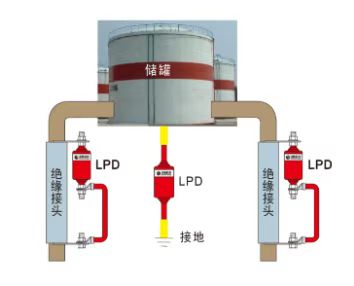 因?yàn)閮?chǔ)罐內(nèi)外壁實(shí)施了陰極保護(hù),導(dǎo)致儲(chǔ)罐的接地成為陰極保護(hù)的一個(gè)電流故障點(diǎn)。因?yàn)榻拥伢w一般采用鋅鍍材料的原因,在初始用時(shí)接地對(duì)陰極保護(hù)的影響很小,但隨著接地材料在地下使用的原因,鋅鍍會(huì)在一兩年內(nèi)損耗掉,從而導(dǎo)致陰極保護(hù)電流流失,影響陰極保護(hù)系統(tǒng)的正常運(yùn)行。將LPD-100/1000型火花間隙串聯(lián)在接地線之間,正常情況下,該產(chǎn)品處于完全絕緣的狀態(tài),儲(chǔ)罐的陰極保護(hù)電流不會(huì)通過(guò)接地線流失。在遭受雷電時(shí),該產(chǎn)品瞬間導(dǎo)通,將雷電流通過(guò)接地線泄放入地。