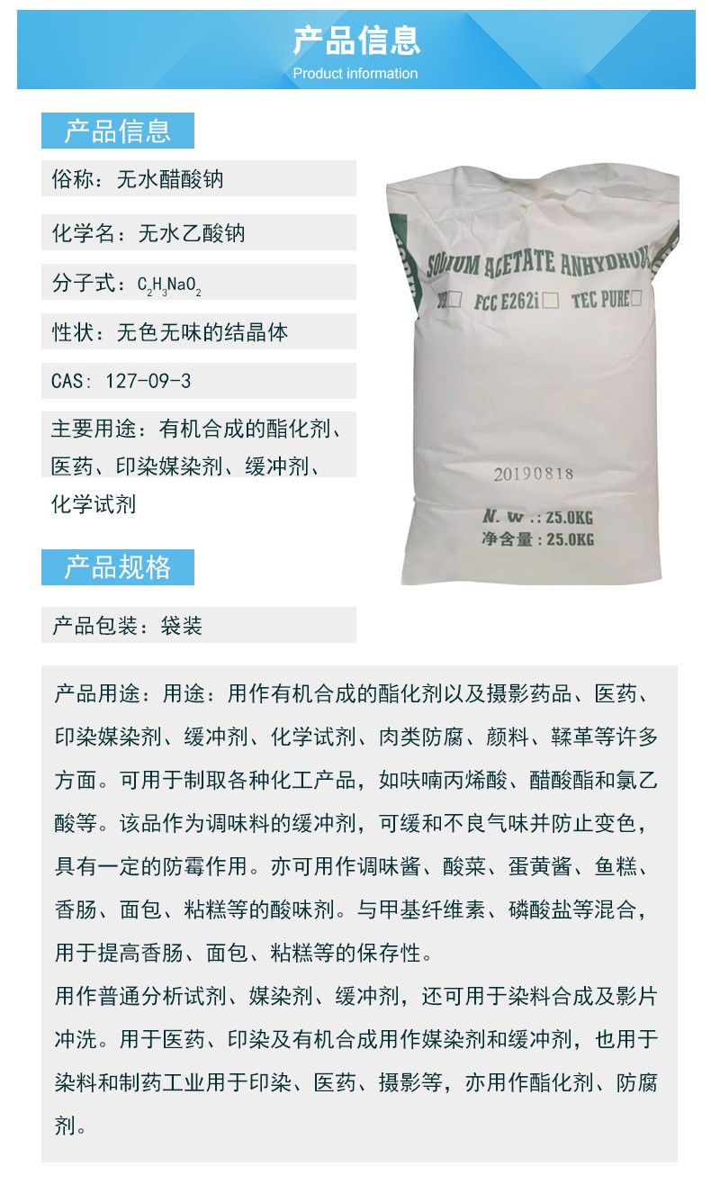 俗稱:結晶醋酸鈉三水醋酸鈉; 乙酸鈉;三水醋酸鈉; 三水乙酸鈉