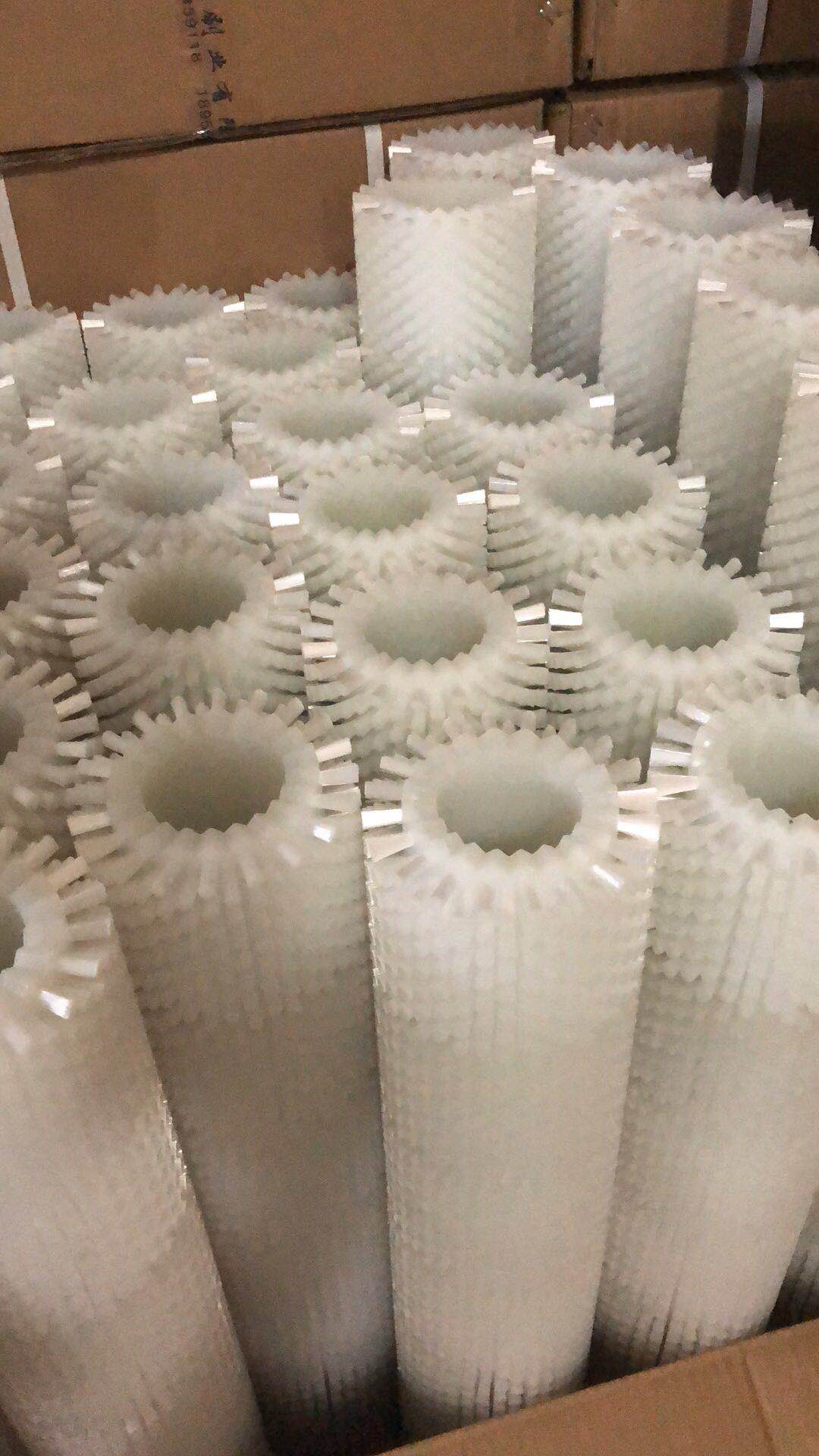 4、玻璃業(yè):產(chǎn)品有清洗機(jī)毛刷輥、磨邊機(jī)毛刷 、PP、PU、PVC、PVA吸水海綿滾輪。玻璃清洗機(jī)刷輥,輥軸為45#圓鋼,刷毛為尼龍材料,如需要加酸液清洗的玻璃清洗線,必須使用全不銹鋼的刷輥用來(lái)防止腐蝕,一般都用條刷機(jī)制成條刷再螺旋形燒焊在輥軸上;吸水輥,采用高密度親水分子的海綿制成,吸水性能好,干燥快,用來(lái)對(duì)玻璃表面的水滴進(jìn)行全面快速吸干。