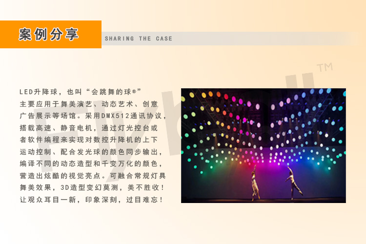LED升降球,也叫“會(huì)跳舞的球”主要應(yīng)用于舞美演藝、動(dòng)態(tài)藝術(shù)、創(chuàng)意廣告展示等場(chǎng)館。采用DMX512通訊協(xié)議,搭載高速,靜音電機(jī),通過燈光控臺(tái)或者軟件編程來實(shí)現(xiàn)對(duì)數(shù)控升降機(jī)的上下運(yùn)動(dòng)控制、配合發(fā)光球的顏色同步輸出,編譯不同的動(dòng)態(tài)造型和千變?nèi)f化的顏色,營(yíng)造出炫酷的視覺亮點(diǎn)。可融合常規(guī)燈具舞美效果,3D造型變幻莫測(cè),美不勝收!