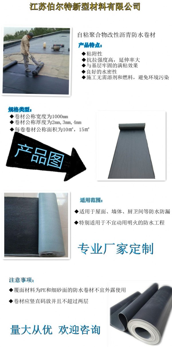 本網頁所展示的有關 江蘇伯爾特新型材料有限公司 為你提供的“自粘聚合物改性瀝青防水卷材”金屬建材價格、型號、圖片、廠家等信息。如有需要請撥打電話:0527-80967228。