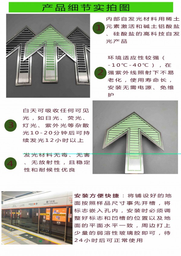 我司制造生產的地鐵蓄光疏散標識系統吸收可見光5-10分鐘,可在暗處持續發光12小時以上,且發光效果無半衰期,可持續循環使用30年以上,只要不人為破壞就無需更換,一勞永逸。在地下軌道交通發生停電等緊急情況下,可以有效的指引人群疏散逃生。