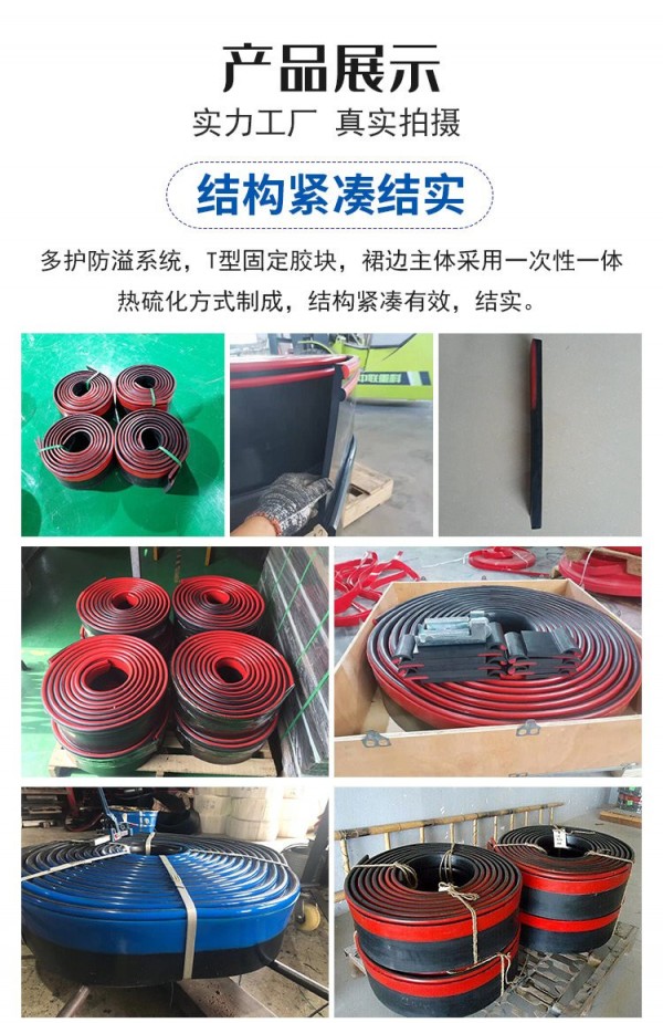 5.多護(hù)防溢系統(tǒng),T型固定膠塊,皮帶機(jī)防溢裙板裙邊主體采用一次性一體熱硫化方式制成,結(jié)構(gòu)緊湊有效,結(jié)實(shí)耐用。背面的T型固定膠塊可根據(jù)客戶(hù)要求在制作的過(guò)程中去掉,以適應(yīng)過(guò)去老的安裝方法。山東美奐