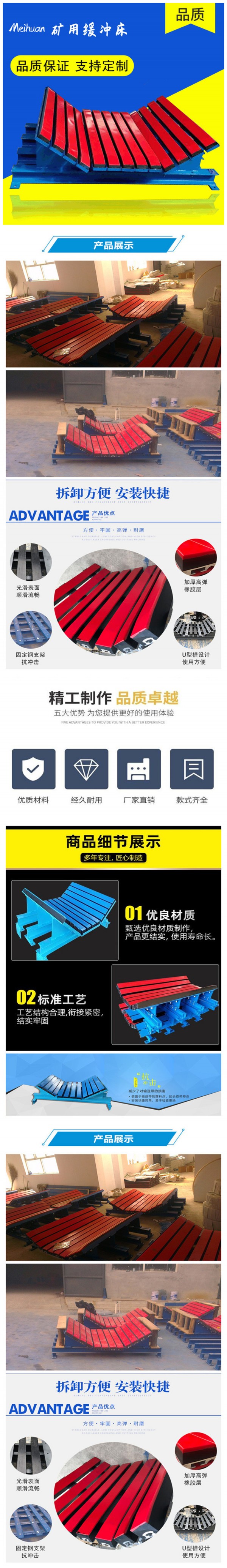 緩沖床用于落料點代替普通緩沖托輥,能有效避免尖銳物體插入膠帶從而防止撕裂膠帶。整體托住膠帶,落料時膠帶不會凹陷,有效導正落料,防止膠帶跑偏,防止物料溢出。整體承受物料沖擊,相對于單個承受沖擊緩沖托輥,壽命大大提高。