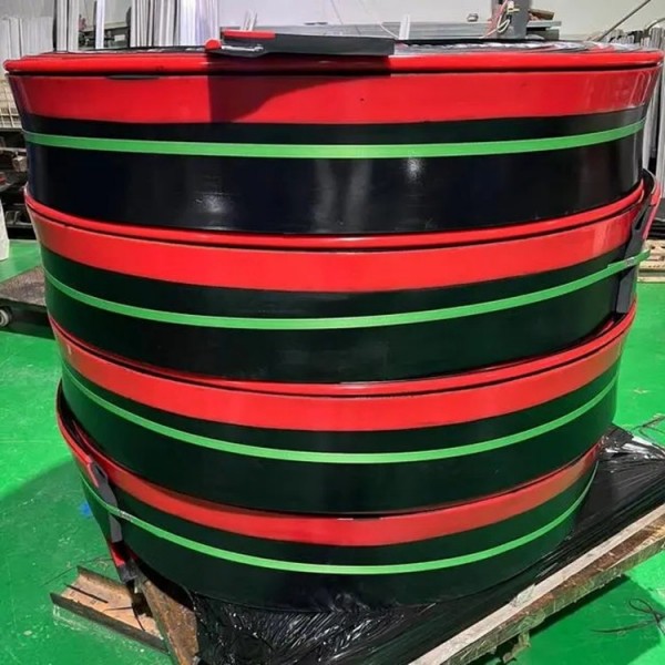 1. 防溢裙邊的主體部分為黑色,采用 橡膠和丁苯橡膠混煉而成,在保持挺括的基礎上增加彈性,使紅色的多防護密封條緊密的貼服在輸送帶上,甚至當多護系統達到使用即將磨損完后還能夠繼續履行防溢裙邊的防溢效果。