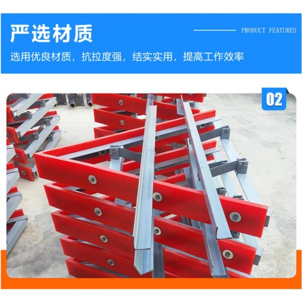 清掃器刮板采用聚氨酯高分子材料制作,具有阻燃抗靜電性、高耐磨性、高彈性、耐酸堿性、摩擦系數低等特點,不會對輸送帶造成損傷,使用壽命長。