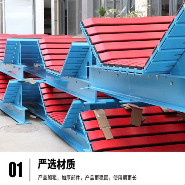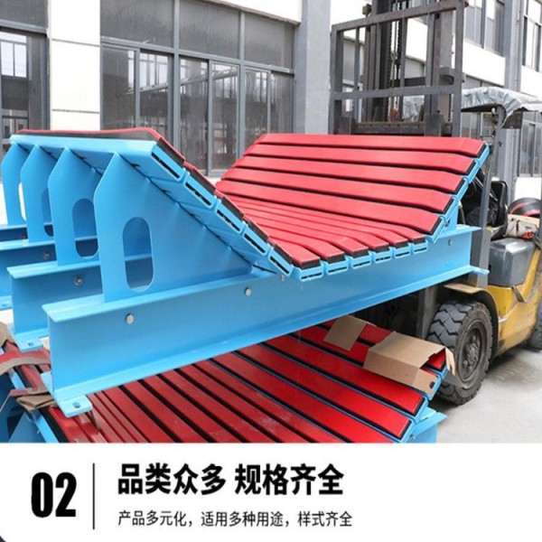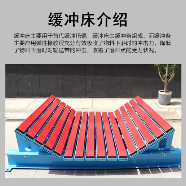 緩沖床在有沖擊力的環境下可吸收物體對皮帶的沖擊力,諸如輸送介質顆粒直徑較大,落料高度較高等工礦條件下。緩沖床中重要的部分是緩沖條,緩沖條彈性高才能更好的吸收物料下落得沖擊力。