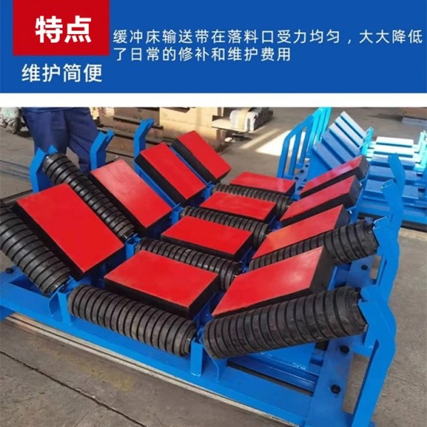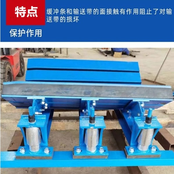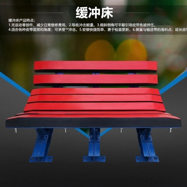 傳統(tǒng)礦用緩沖床由于無法解決大塊物料、矸石對緩沖床的巨大沖擊,常常導致帶式輸送機皮帶帶面磨損嚴重甚至劃傷,目前傳統(tǒng)礦用緩沖床只在緩沖條上做文章,通過調(diào)節(jié)緩沖條耐磨層和緩沖層對緩沖效果及耐磨效果進行調(diào)節(jié),但不管調(diào)節(jié)耐磨層還是調(diào)節(jié)緩沖層都無法從本質(zhì)上解決帶式輸送機傳統(tǒng)緩沖床的抗沖擊缺陷